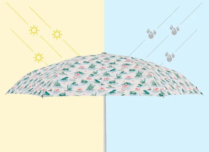 伞面涂有防泼水涂层,水珠落在伞布上会立马滑走,就像雨水滴落在荷叶上一样。