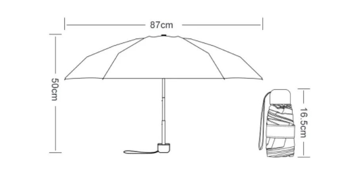 五折伞撑开直径87cm、折叠高度16.5cm、撑开高度50cm。重量156g。