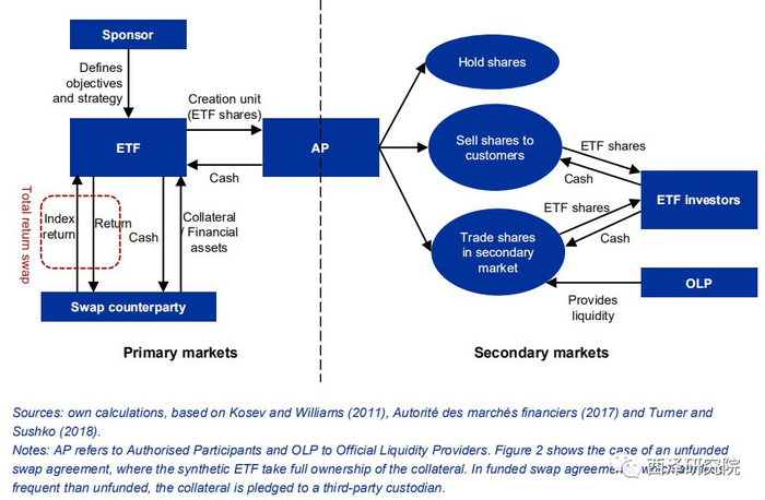 像所有交易所交易的产品一样,ETF跟踪指数或其他金融工具,可以在二级市场上进行交易。虽然下文中的大部分讨论适用于更广泛的ETP类别,包括交易所交易票据(ETN),交易所交易商品和ETF,但是本报告侧重于阐述ETF。ETF的结构存在显著的异质性,以达成投资目标。在分析ETF对系统性风险的可能产生的影响之前,本节将简单介绍一下ETF市场和主要ETF结构。