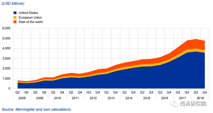 ETF规模及其底层资产的快速增长可以解释它们广受世界各地监管机构持续关注的原因。近年来,ETF和其他被动投资种类的市场份额大幅增长,特别是在美国和欧盟。鉴于常态下ETF的低成本和高流动性,它已成为众多投资者青睐的投资选择。与此同时,越来越多的证据表明:ETF数量的攀升可能会影响证券市场的风险特征,而复杂结构的ETF,如杠杆式与合成式ETF,可能会加强这种风险特征(金融稳定委员会,2011;国际证券委员会组织,2013等)。
