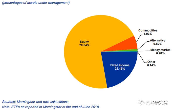 随着ETF规模的增长,ETF所跟踪的基础资产范围也在扩大,包括股票、债券、大宗商品、货币、甚至指数,例如VIX指数。欧洲约有70%的ETF跟踪股票指数(图5),但是近年来跟踪其他金融资产(特别是固定收益证券的ETF)的份额呈现持续增长态势(Morningstar,2017)。