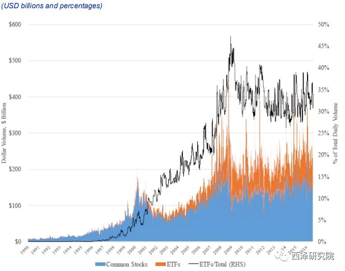 ETF的市场份额也相应上升:尽管它们仍旧只占总市值的一小部分,但交易量可占到美国股市日交易量的30%以上(见图3和4)。
