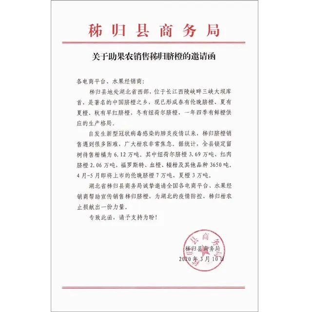 秭归县紧急发出了“助农邀请函”,详细说明了当地橙类水果滞销的情况。