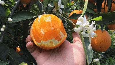 注:由于成熟晚,4月的果园里,去年的果实、今年的橙花在同一枝头上争奇斗艳,形成了“花果同枝”的热闹景象。
