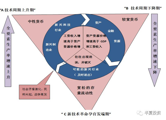 当第二阶段发展了2,30年后,会使得市场里充斥着低成本的泛滥的流动性,大家对新技术革命非常期盼,但新技术的火光闪现,资本就会集中追逐,形成技术泡沫。