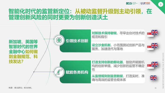BCG《报告》指出,目前全球范围内金融活跃、科技水平的发达市场,都已采取主动式监管模式,支持技术创新,引导金融科技与财富管理行业规范发展。