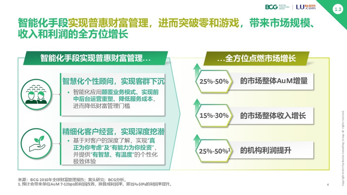 BCG与陆金所的《报告》指出,财富管理机构通过智能化的个性顾问服务、精细化的客户经营手段,正在快速下沉传统目标客群、深挖客户潜力,从而点燃新一轮市场增量。智能化必将成为下一个十年全球财富管理行业发展的重要方向。