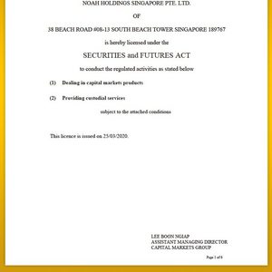 3月25日,诺亚控股新加坡私人有限公司(简称“诺亚新加坡”), 诺亚集团的全资子公司, 获得新加坡金融管理局(MAS)颁发的资本市场服务牌照。