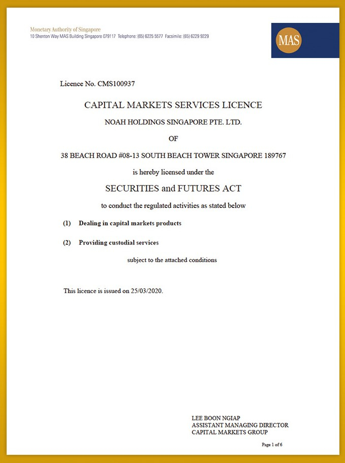 诺亚新加坡获得新加坡金融管理局(MAS)颁发的资本市场服务牌照