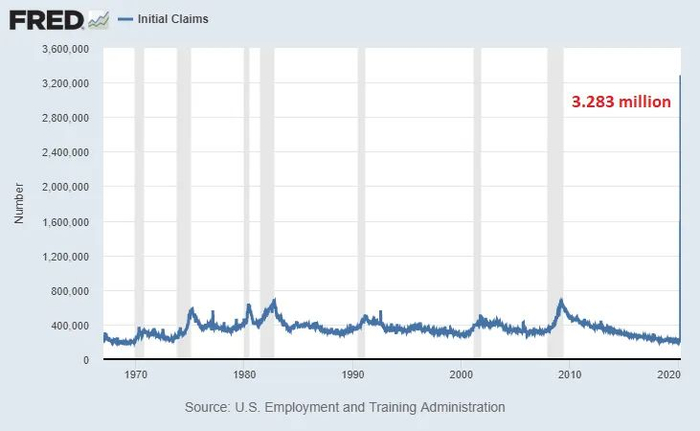 以下是美国每周首次申请失业救济的人数的50年数据,最近这周的飙升看起来像是一个数字输入错误,但实际上并不是: