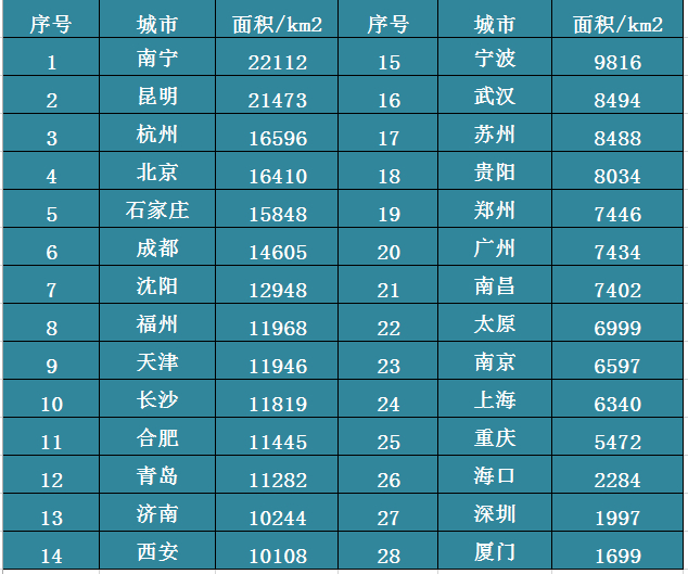 下面这张图是28个主要城市的现在面积图,可以预见,未来那些面积小于1万平方公里的超级城市,基本都会通过吞并周边城市的方式进行扩容,在地理上做大城市,为今后长远的发展储备空间。
