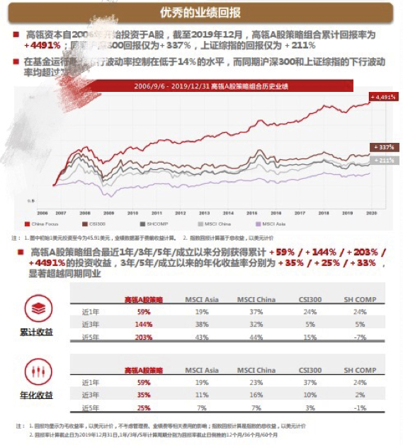 这份材料还显示,高瓴资本自2006年开始投资A股,截至去年12月,高瓴A股策略组合累计回报率为4491%,同期沪深300回报为337%、上证综指的回报为211%。其中,高瓴A股策略组合最近1年、最近3年、最近5年、成立以来分别获得累计59%、144%、203%、4491%的投资收益,3年、5年、成立以来的年化收益率分别为35%、25%、33%。这一业绩即便放在一众优秀的私募基金中也很显眼。