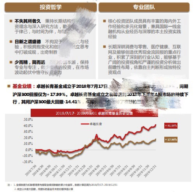 除此之外,材料还介绍了卓越长青基金的业绩、架构、产品要素等。例如,该基金成立于2018年7月,首次认/申购不低于300万元,认/申购费率为1%,每月15日开放等。