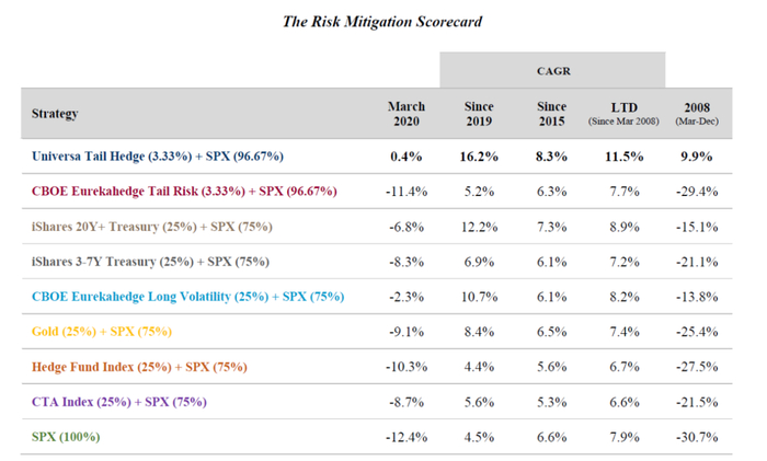 只需要3.33%的组合头寸,就能在2020年3月带来12.7%收益率,2019年带来11.6%复合收益率,2008年3月带来3.6%的额外复合收益率。同时,其他的另类风险管理工具,全部都跑输我们的组合,而且是在全部时间段上。