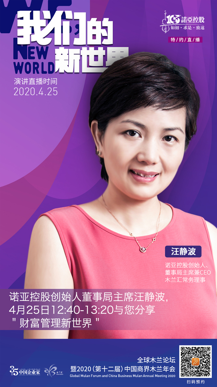 4月25日,诺亚控股集团董事局主席兼CEO汪静波女士将现身木兰论坛《我们的新世界》专场直播间,为您带来她对未来的思考和洞察。