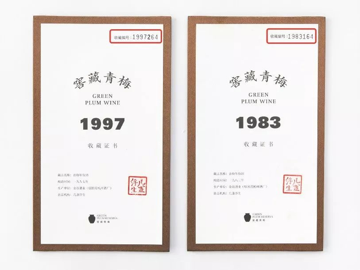 窖藏青梅1997、1983都有收藏证书,每一瓶都有唯一的收藏编码。