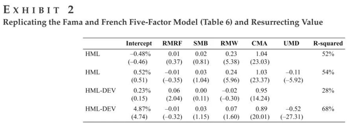 图2的第一行时复制原始的版本,正如第一行所示,HML在这个特定的模型中确实是多余的。现在,让我们在图2第四行再加回动量因子。我们发现HML-DEV的截距项显著异于0,证明价值因子不是多余的。