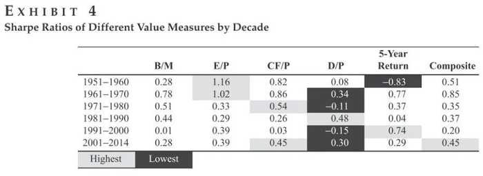 关于价值因子的经济解释存在一场生动而健康的辩论。不存在一个价值模型如此令人信服。在大萧条和全球金融危机期间,人们认为风险是价值因子的基础。行为理论侧重于投资者对信息的误判,导致暂时的误定价。如果价值是一种风险溢价,那么,这是否意味着我们期望它始终存在呢?如果风险或风险补偿发生了变化,那么预期收益也将随之改变。相反,如果价值因子不是风险,而是由于错误定价产生的,那么它是否也遵循价值回归规律并最终消失呢?不,如果错误定价消失,投资者的偏见将不得不消失,或者有足够的资本愿意控制交易。