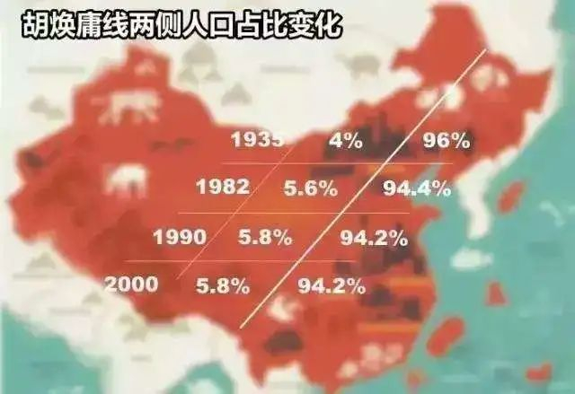 “自黑龙江之爱辉(今天黑龙江黑河市瑷珲区),向西南作一直线,至云南之腾冲为止,分全国为东南与西北两部:则此东南部之面积,计400万平方千米,约占全国总面积之36%;西北部之面积,计700万平方千米,约占全国总面积之64% ;惟人口之分布,则东南部计4. 4亿,约占总人口之96%;西北部之人口,仅1800万,约占全国总人口之4%。”