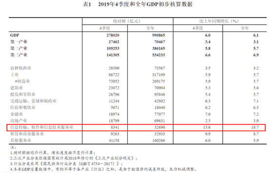 下图是国家统计局发布的2019年全国GDP分产业的增长情况,可以看出信息传输,软件和信息技术服务业达到3.269万亿元,增长了15.6%,远远快于GDP总体6.1%的增速。