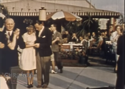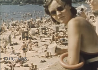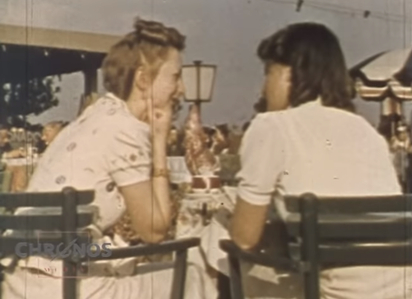 注意下图中这个女子手里拿的是纸杯,在视频中她喝完水后很自然的把杯子捏扁,可见当时造纸工业已经非常发达,足可以供给普通市民纸杯饮水的需要,而她戴的眼镜是深色的,不知道是否是太阳镜。