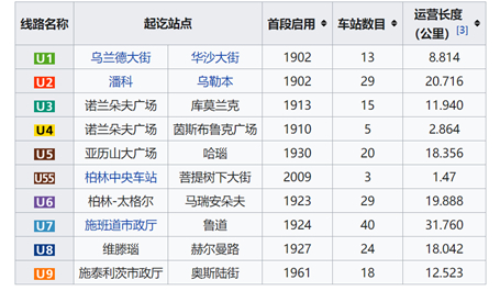 进一步查询了柏林地铁各条线路的通车时间,柏林在2020年的今天总共有10条地铁线路,这10条的线路的通车时间分别为: