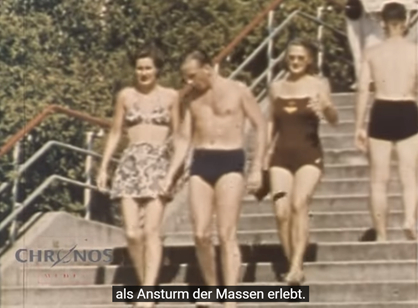 下图为当时柏林市民在著名的万湖游玩和休闲,市民的衣着已经有了专门的泳衣,河边修筑的台阶和栏杆的样式已经和今天没什么两样了,河边游泳的游人人数众多。我觉得即使是从今天穿越到当时的万湖边去游泳,不会有任何穿越感。