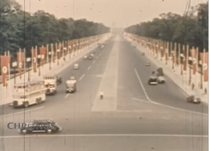 开篇的画面便觉得有点震撼,因为如果把这个画面定格,然后让你猜测这是哪一年的话,如果不看那些旗帜,并忽略掉渣画质以及汽车的样式,并没有那么容易猜测出来,平整的水泥公路路面,以及川流不息的汽车,在下面的截图里面,就可以看到一二十里辆汽车在行驶,两旁是标准的行道树,和今天的街道相比的话,仅仅是汽车的形态不一样。