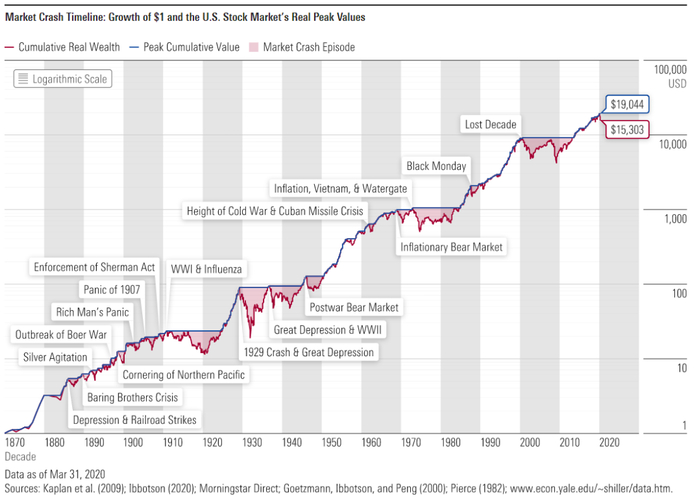 由此可见,在整个19世纪、20世纪和21世纪(甚至在冠状病毒爆发之前),市场崩溃已经发生了无数次,认识它们的频率能帮助我们更好地了解股票投资的风险。