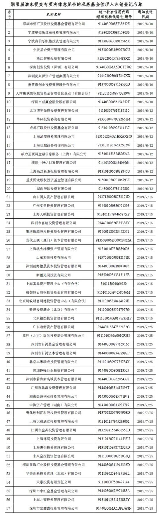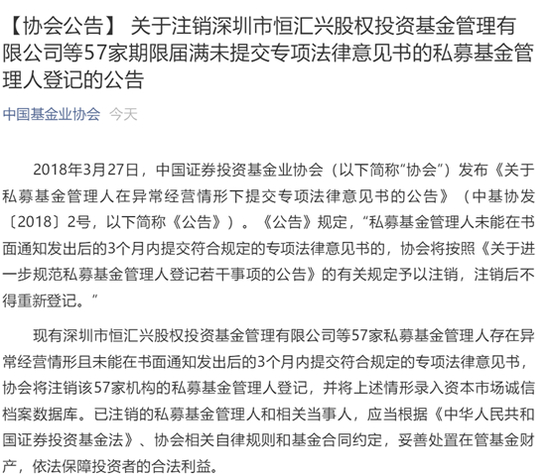6月12日,基金业协会又发布了一批被注销私募名单,57家私募因为没有在异常经营情况下提交专项法律意见书被注销。