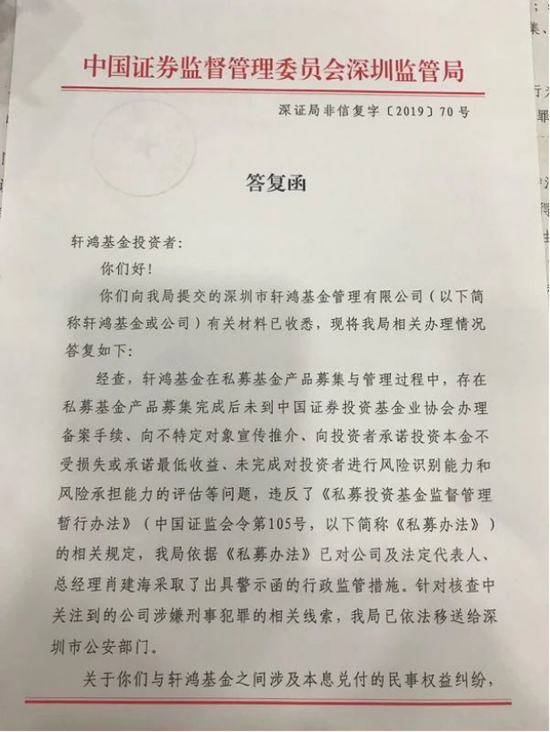 而据《国际金融报》今年3月报道中的一份材料显示,深圳证监局于2019年6月19日向深圳轩鸿投资者出具了答复函,显示深圳轩鸿在私募基金产品募集与管理过程中,存在私募基金产品募集完成后未到中国证券投资基金业协会办理备案手续、向不特定对象宣传推介、向投资者承诺投资本金不受损失或承诺最低收益、未完成对投资者进行风险识别能力和风险承担能力的评估等问题,深圳证监局已对肖建海采取了出具警示函的行政监管措施。