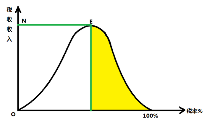 拉弗曲线:E点表示税收最高点;黄色区域为禁止收税区
