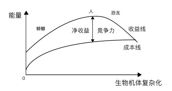 节约能量和扩大收益之间的关系是动态的,最重要的是两者之间的差额。新增器官可能消耗更大能量,但也能带来更大收益;同样的收益,你能节约能量,你就获得生存优势。