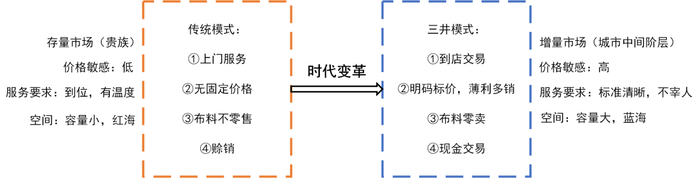 三井高利的信心来自于对趋势的把握:和服过去的消费主力,是居住在江户的贵族。这一人群的特点是,对价格不敏感,但是对服务的质量和温度敏感。因此整个和服店的商业模式都是围绕着这些特点来展开的: