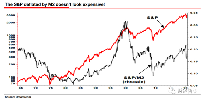 类似的,美股以传统的市盈率,市净率指标衡量处于历史的估值高点,高于绝大部分国家,但换成以国债收益率,或者货币增速来折算估值,那么美股也并没有超越历史的高位。