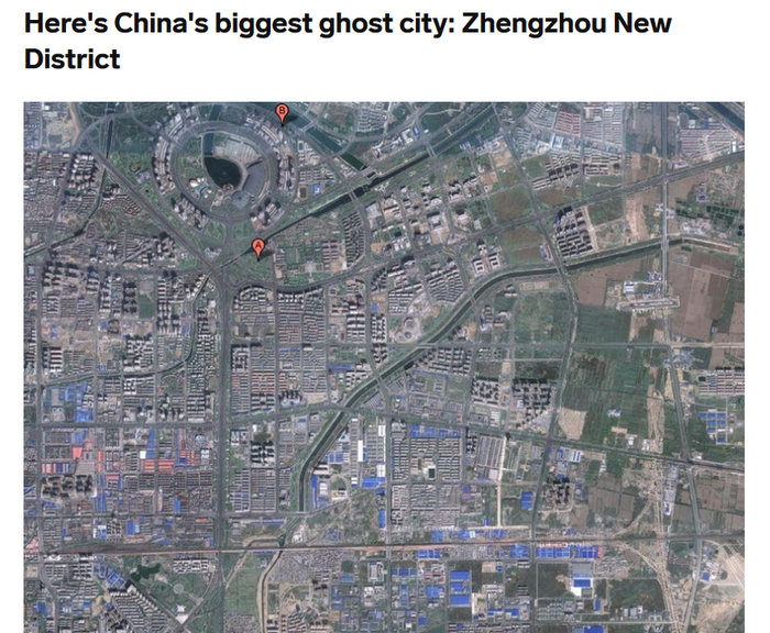 2010年,郑东新区已具雏形,然而就在此时,美国商业内幕网展出了一系列卫星图,郑东新区被冠上“China’s biggest ghost city(中国最大鬼城)”的称号,照片中的新城街道空荡,房屋无人,新区湿地公园宣传照中的人群还被特意指出是PS上的。
