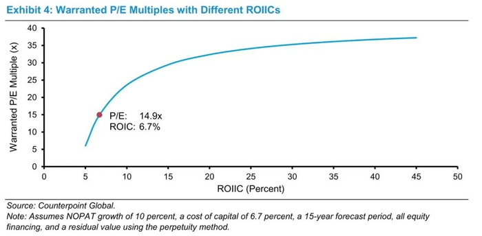 图4展示了结果。回顾一下,通用P/E 倍数(commodity P/E)为14.9。可以这么想:ROIC告诉了你为了达到一个假定的增速,你所需要做的投资金额。高ROIC意味着你不需要投资太多即可以增长,这意味着有更多的剩余现金留给股东。低ROIC意味着你必须投资很多资本才能增长,意味着留给股东的现金更少。