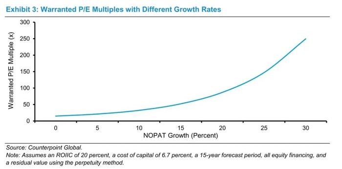 图三显示了增长和P/E倍数的关系是凸性的。预期增长率的小幅变化就可以导致P/E值的很大变化,尤其是增长率很高时。