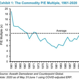 权益资金成本从而通用P/E倍数(commodity P/E multiple)的变动是因为无风险利率和股权风险溢价的变动。图一展示了通用P/E倍数(commodity P/E multiple)从1961年到2020年5月间的情况。这些倍数是基于Aswath Damodaran估测的股权风险溢价计算而来的,Damodaran是纽约大学Stern商学院在估值方面的优秀的专家。