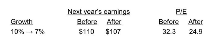 注意到第二年的增长仅仅降低了2.7%,但公允的P/E倍数陡降了22.9%。投资者通常用当前价格除以下一年盈利来计算P/E值。因此,有时候他们相信市场对近期盈利的小幅变化过度反应了。但如果对增长的轨道增速预期确实下行了,P/E倍数的明显下降是完全合理的。