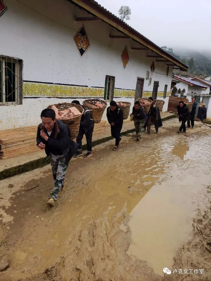 丰国军等扶贫干部在帮彝族贫困户盖房子中