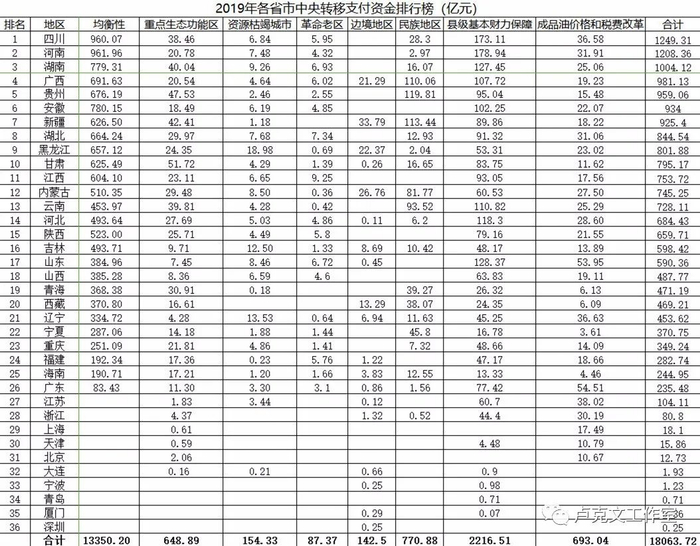 以下两张图,分别是2018年、2019年中国各省财政转移支付表: