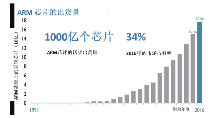 此后,随着iPhone智能手机的热销以及Android系统的推出,全球进入了智能移动手机的时代,而ARM也即将随着苹果以及一众安卓厂商和移动芯片厂商的支持,而登上移动终端时代的“王座”。由于ARM处理器占据移动终端设备市场90%的份额,ARM每年的出货量从2013年的每年100亿台上涨到现在每年的200亿台。