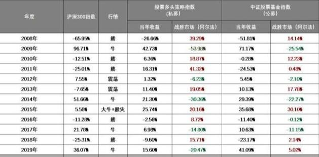 当年牛市:公募私募都很难战胜指数。当年熊市:公私募都完胜指数。熊市私募完胜公募,牛市公募完胜私募。看十年:长期总收益率,私募完胜公募,公募完胜指数。