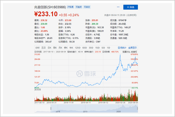 业务体量不比别人大,盈利能力也一般,兆易创新这家成立15年、2016年上市的公司,股价却一路从发行价23.26元拉高至目前220.89元,上市4年飙涨37倍(后复权计算)。