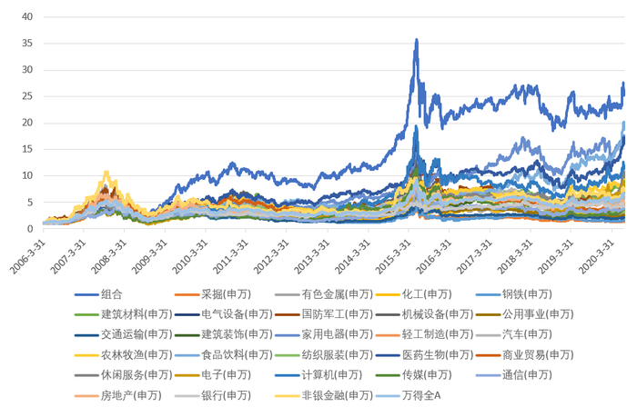 按照该轮动规律进行投资,我们拟合了一条组合的曲线,可以看到2006年至今可以获得25倍左右的回报,并且大幅度跑赢单个行业的表现。