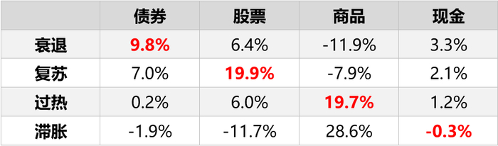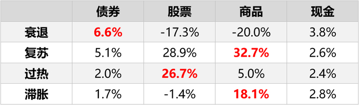 注:商品在滞涨期28.6%的表现主要由于1970s能源危机带动的油价大幅上涨,若排除该阶段,商品在该阶段是负收益。