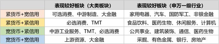 宽货币+宽信用,此阶段经济企稳开始复苏,上游资源(采掘、有色)和大金融(房地产、银行),两类板块均具有周期性,在此阶段表现好比较容易理解。