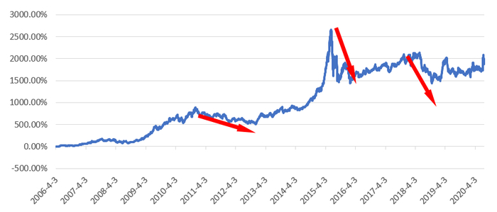 使用周期股替代商品指数后,组合的走势方向没有发生变化,投资收益反而更加可观了,究其原因是股票市场的预期思维,商品价格走势受制于实际需求、库存等因素影响,往往价格涨幅不会很离谱,但股票市场中,一旦周期性企业的未来盈利预期大幅改善,市场就会在短时间内蜂拥而至拉高股价。