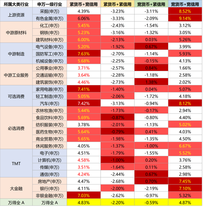 紧货币+宽信用,该时期是市场最热的时期,绝大多数板块都在这个时期表现得最好。超额收益最为显著得板块为可选消费(家电、汽车)、中游制造(国防军工)、中游原材料、大金融(非银金融)。